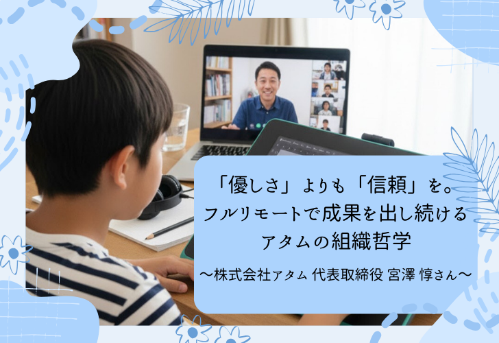 こうした教育を支えているのが、完全オンラインで全国・海外とつながる指導体制と、社員一人ひとりがプロとして自律と責任を重んじる組織文化です。本記事では、アタムがフルリモートという環境下でどのように「健やかさ」と「つながり」を保ち、自律した働き方を実現しているのか、その具体的な取り組みと考え方を紐解いていきます。